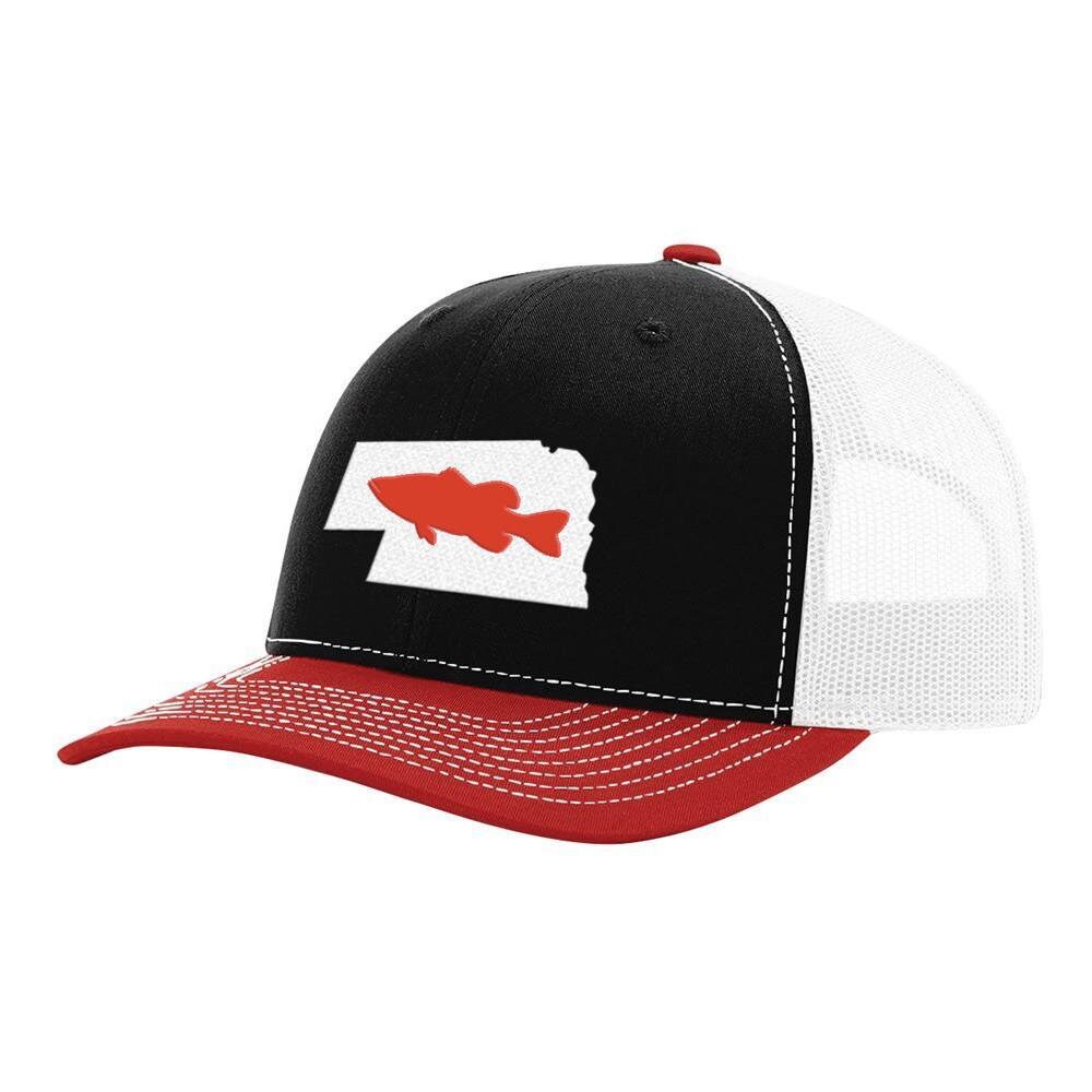 Nebraska Red Bass Hat - Adjustable Mesh Snapback Hat, Embroidered Fish Hat, Bass Fishing Trucker Hat, Patch Hat for Unisex - Black/White/Red